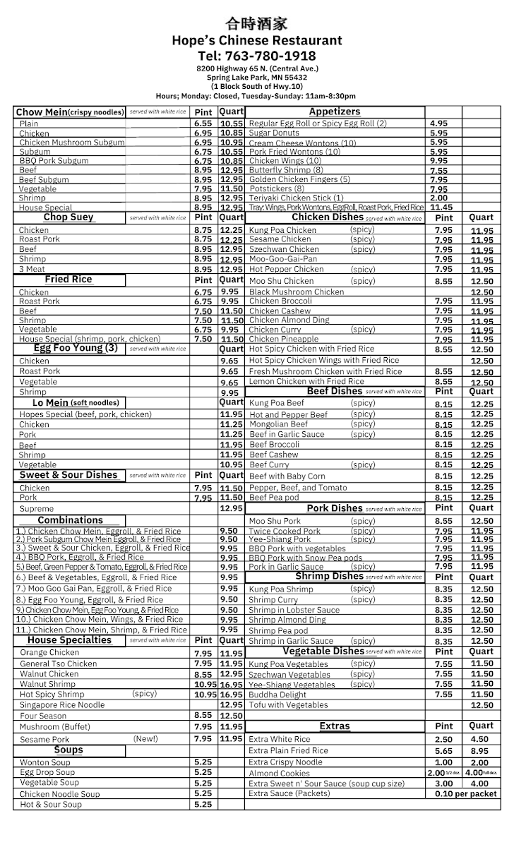 Welcome to Hope's Chinese Restaurant, a treasured spot located in Spring Lake Park, MN that has stood the test of time. Offering a delightful array of classic Chinese dishes, this restaurant prides itself on fresh ingredients and authentic flavors. Customers rave about their favorites, such as the General Tso's chicken and tofu with vegetables, both known for their perfect balance of spices and freshness.